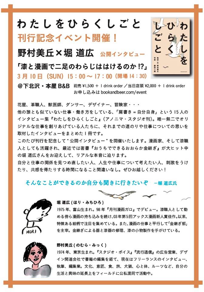 事後報告ですが、B&Bの野村美丘さん著「わたしをひらくしごと」刊行記念のトークショーに出て、美丘さんに好き勝手話しました。