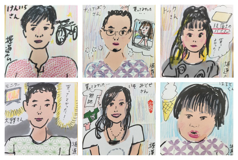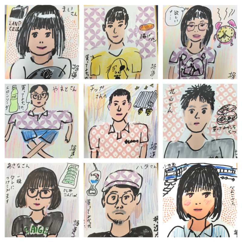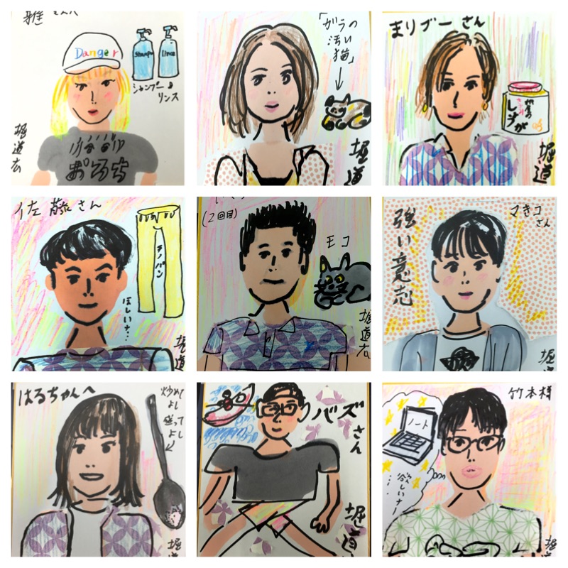 昨日の科学技術館での「Tシャツラブサミット 漫画家似顔絵コーナー」にお越しいただいた方、ありがとうございました。45人くらい描きました。全部は撮れなかったので、一部をアップします。最近買って良かったもの、又は欲しいもの をとなりに描いたのですが、「シャンプー&リンス」「お風呂のフタ」とか「調理器具」とかがあって、おもしろかったです。服の柄のバリエーションが、切り紙になったのですが、もっとあれば良かったな、と思いました。