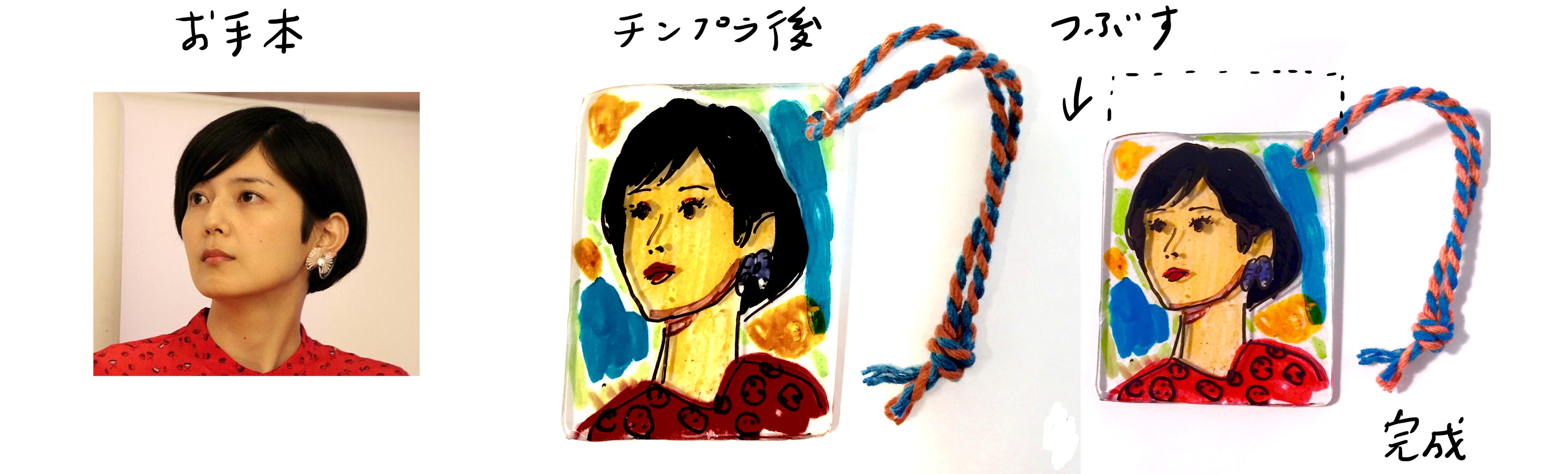 「マッシュのホームパーティー」のパンフ用に必要ということで、菊池亜希子さんのチンプラ(チンするプラ板似顔絵)をしたんだけど、プラ板を焼いた時の縦横の収縮率の違いで、面長な、違う人になってしまった。だから、パソコンのフォトショップでちょっとだけペシャってつぶしたら似た気がしたので、送信した。(これで似てない、という批判が出れば、切腹しかないです)収縮率の違いによる顔の変形は、チンプラあるあるなんだけど、なかなか共有してもらえる人が少ない。