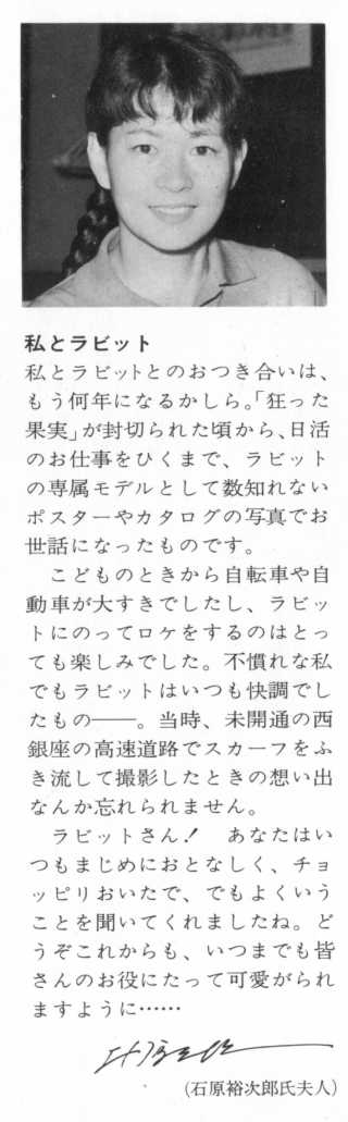最近になり原付より早いバイクが欲しくて、たまたま富士重工のスクーター、ラビットについて調べていたら、石原裕次郎夫人についてはラビットとの深いおつきあいの記事もありましたし、義兄の石原慎太郎都知事にいたっては、ラビットで南米1万キロ横断まで走破されていたっていうのは、有名な話なんですかね?