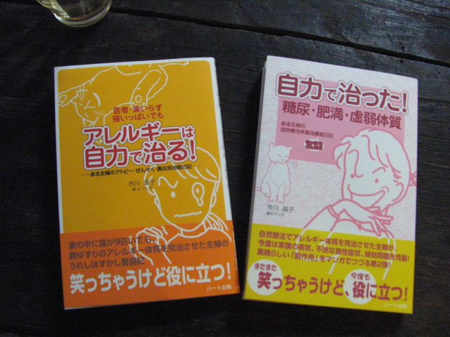 最近読んだ本。市川晶子さん著「アレルギーは自分で治る!」とその第2弾「自力で治った!糖尿・肥満・虚弱体質」。猫をいっぱい飼っている普通のいち主婦の方が描いた文とマンガ、なんですがためになります。お医者さんの言うことがすべて正しいわけではないんですね。やっぱ食べ物かー。
