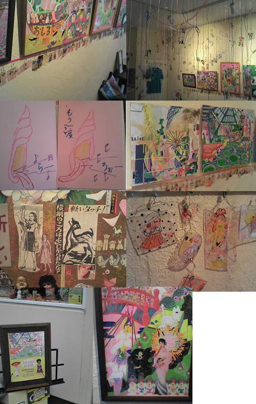 プラ板をオーブントースターで焼いて小さくした、なんだか懐かしい感じのものが、吊ってあるのもあわせて400点くらいあって、よく見ると土人とか植物とかそうとうイイ絵が描いてあります。中でも、コラージュが秀逸でした。個人的には、「横綱のころはよくしかられたなぁ」というのがツボでした。