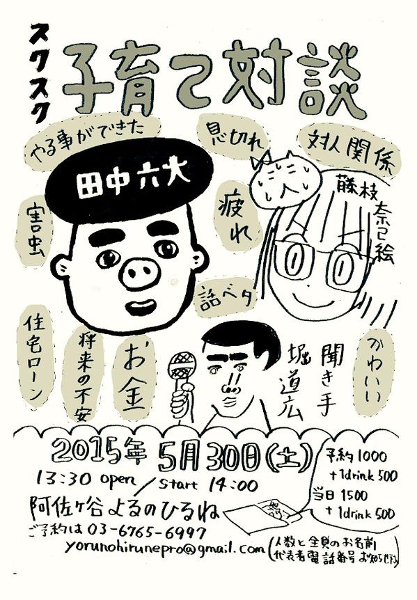 5/30日の田中六大さん藤枝奈己絵さんとのトークショー「スクスク子育て対談」にお越しいただいた方、満席で「よるのひるね」に入りきらなかった約56万人の杉並区の方、申し訳ありませんでした。 株主総会ほどの、大勢のお客様にお越しいただきました。拙いイベントにお越しくださった方、本当にありがとうございました。
