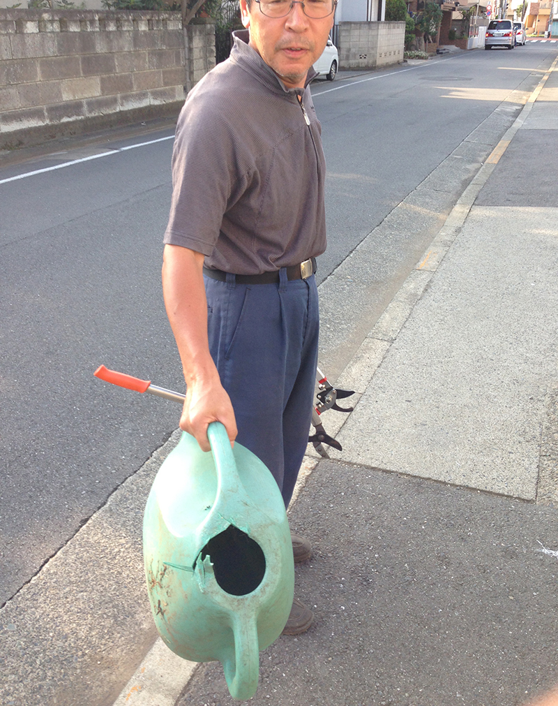 おじさんがじょうろの口を切ろうとしたんだけどうまくいかず、