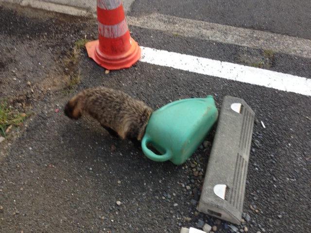 折り返そうと思った矢先、たぬきがじょうろに頭突っ込んで車にぶつかったりしてウロウロ歩いていた。