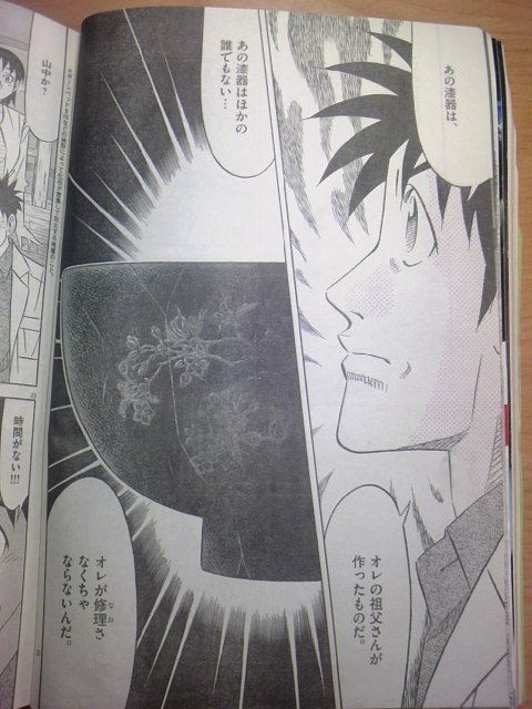 金継ぎの生徒さんから教わったのですが、ビックコミック オリジナル誌でシリーズ連載されている「修理(なおしもん)研究室」という寺沢大介先生作の漫画が、漆器の修理にまつわる話があってとても面白く、仮にも「うるしと漫画」を名乗る私からすると、冷や汗モノ、というかこんなスゴい漫画描かれてはたまらん・・・と思った漫画です。