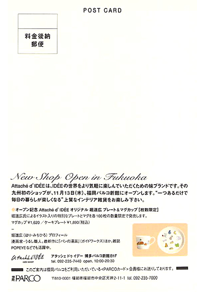 11月13日(木)、福岡PARCO新館のオープンのときと、同時にオープンする IDÉEの姉妹ブランド Attaché d'IDÉE(アタッシュ ドゥ イデー)のオープン記念のオリジナルプレート&マグカップの絵、描きました。