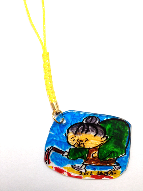 即興で、プラ板に似顔絵か絵を描き、その場でオーブントースターで焼いて小さくして、穴をリューターで開けて、ストラップやキーホルダーにし、製造・販売していました。(約5分)