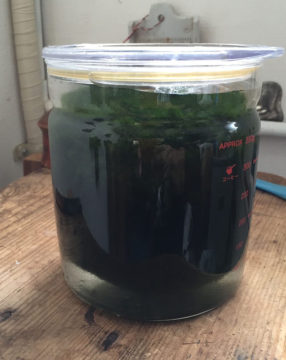 冷蔵庫保存用の瓶に入れ替えたまりも氏の姿。ほぼ一面「藻」!