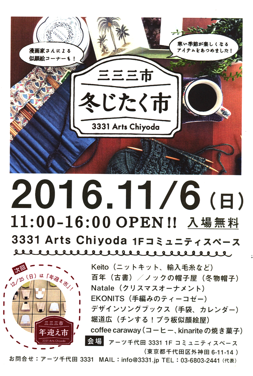 アーツ千代田 での三三三市 冬じたく市 にチンプラで参加しますので、来てください。