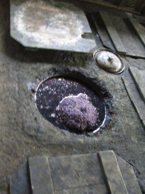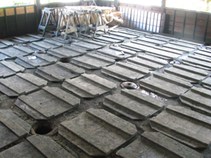 ↑日下田藍染工房にも行った。藍染めって、こうやってんですね。4つの甕穴につき1つの炉がある。冬季はワラを燃してあっためているとのこと。